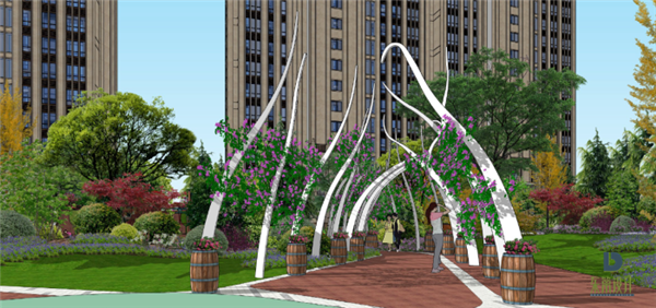 景觀設計提取酒杯的形態設計成獨具特色的亭子,提供休息、靜讀的場所。在亭子上安裝地面投影照明裝置,夜晚時分在地面上投射出不同的影像,充滿趣味性和科技感。