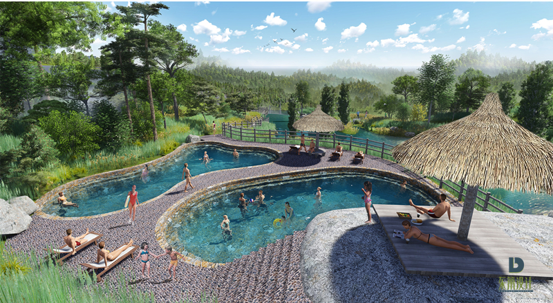 項目充分利用區域良好地形環境,打造生態、天然泳池效果,結合現有山石設計休閑平添,泳池臨山石而建,利用山石堆砌泳池池壁,為游客提供一處休閑、玩水好去處。