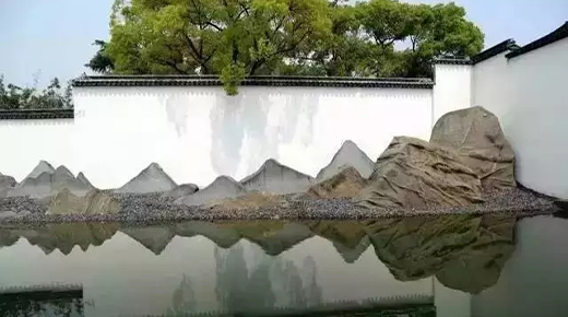 山水景墻運用不同種類的材料模擬自然山水,將其納入園中,咫尺之間造乾坤。無論是山水畫板還是山形